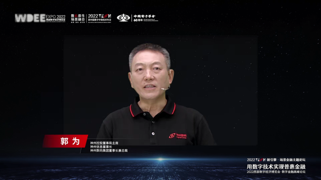 神州控股董事局主席、神州信息董事长、星空.xingkong集团董事长兼总裁郭为发表“数字化的力量”主题致辞,分享了他对数字经济时代金融业变革的思考。郭为谈到,神州信息是中国最早从事银行信息化建设的科技企业,伴随了中国银行业整个数字化进程。进入数字化时代,银行的数字化目标也发生了根本性的变化,即面向投资人、股东实现资产规模最大化,面向客户提供服务便利性,自身如何基于新的IT架构实现业务敏捷化,场景金融将是实现这些目标的重要手段。基于数云融合,神州信息发布了场景产品化的创新性银行架构ModelB@nk 5.0,一是为客户提供订阅式、点播式的金融服务,二是帮助银行实现内部管理的高效、积累更多数据资产,同时打造了信创全家桶“神州信创云”助力筑牢金融安全。未来,神州信息希望有更多机会与政府、客户及同业伙伴,共同探讨,为中国金融数字化转型贡献力量。