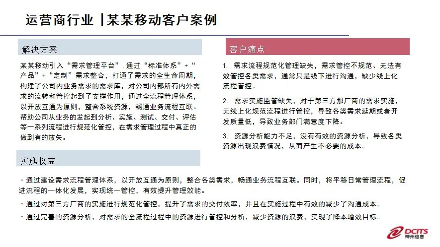 神州信息需求管理平台是一款专为企业设计的需求管控产品,旨在提供一套完整的需求管控方案,以帮助企业实现在业务需求中,从提出到IT实施交付的整个过程的管控。